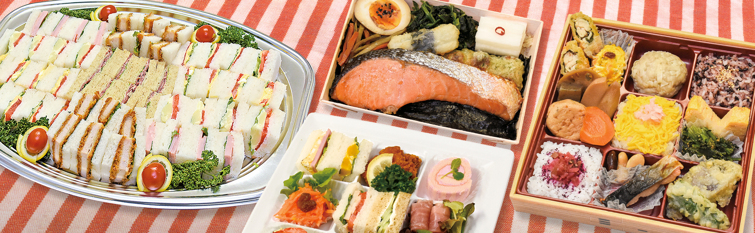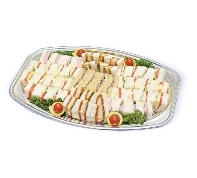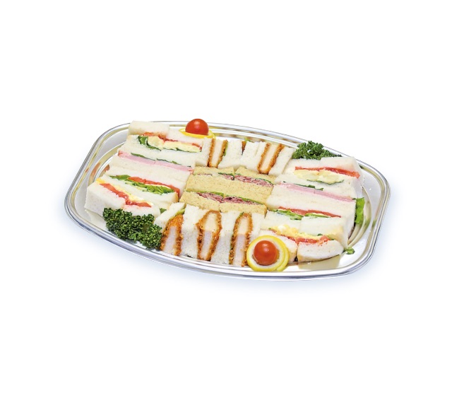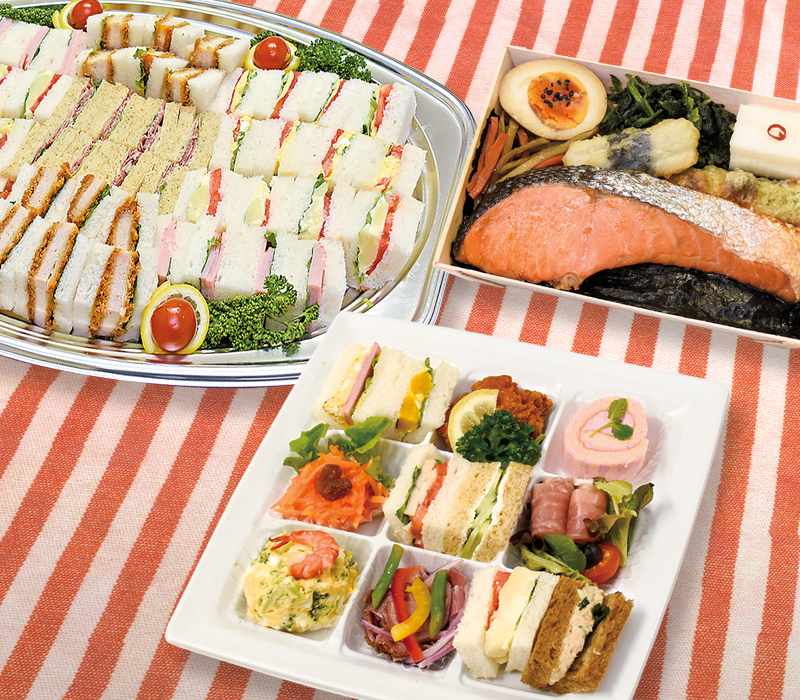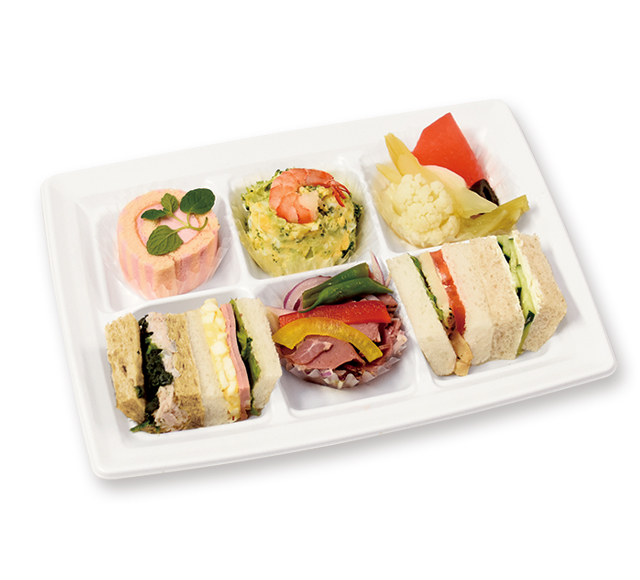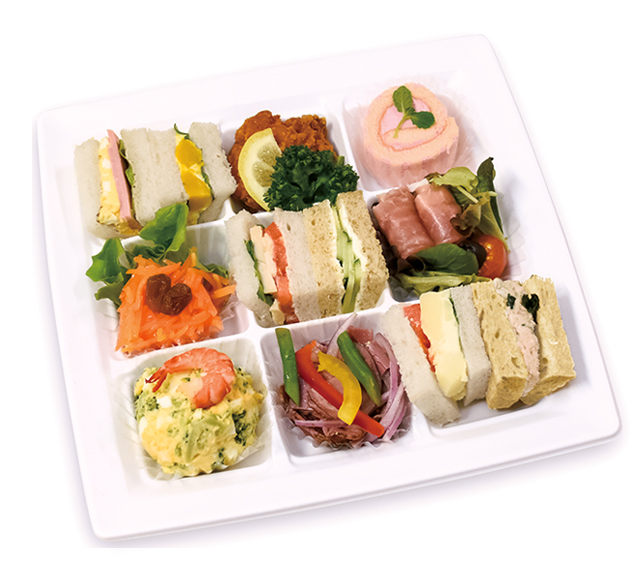 ひと口サイズのサンドイッチに、セレクトしたおかずとデザートを盛り合わせたメニューです。