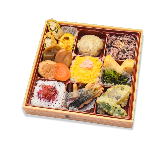 九つの升に色とりどりの料理の数々。 3種のごはんがお楽しみいただける人気のお弁当です。